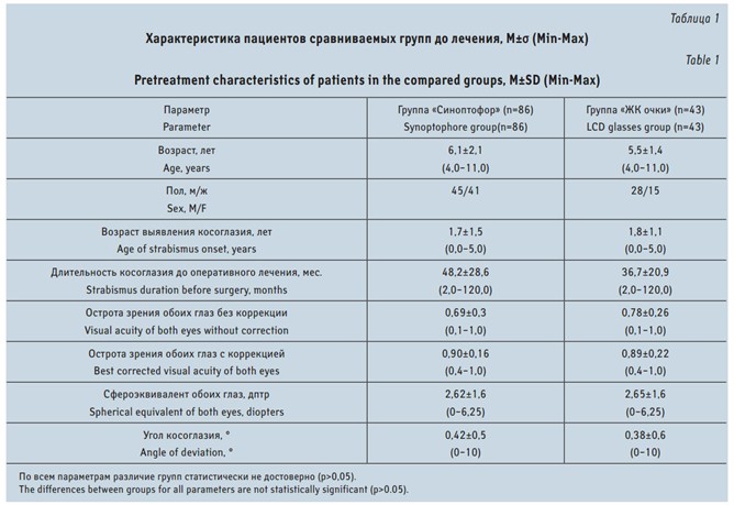 Как видно из табл. 1, сравниваемые группы не различались по исходным данным. Положение глаз у пациентов обоих групп было близким к ортотропии, что создавало благоприятные условия для восстановления сенсорной фузии.